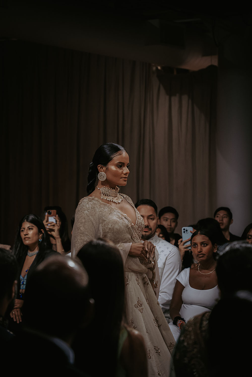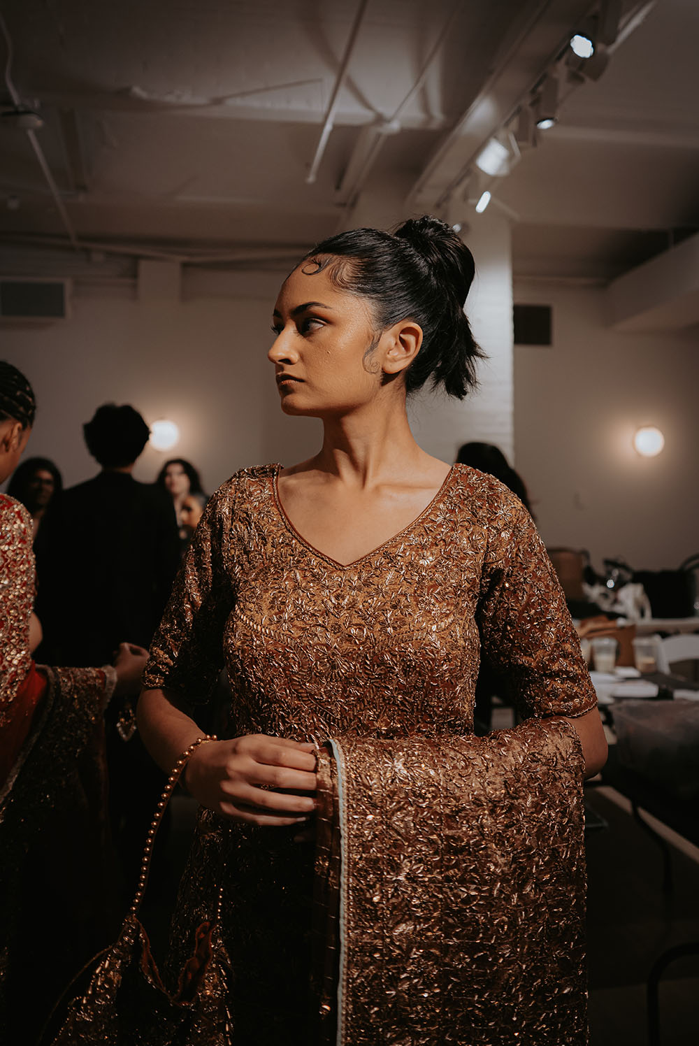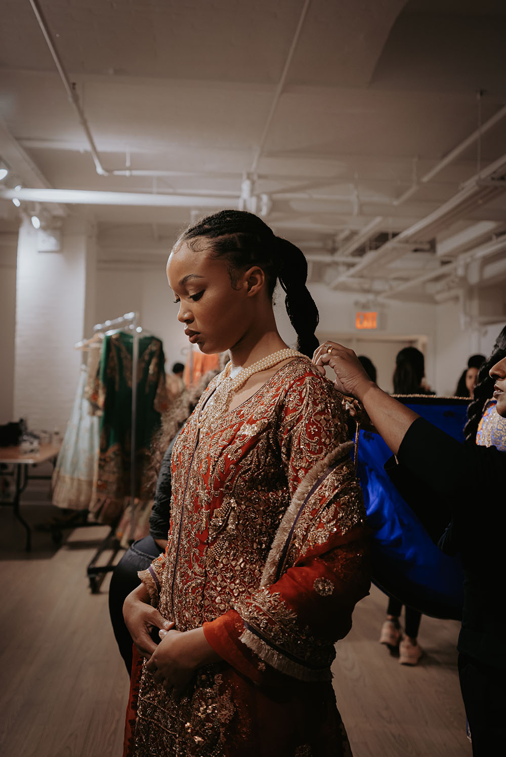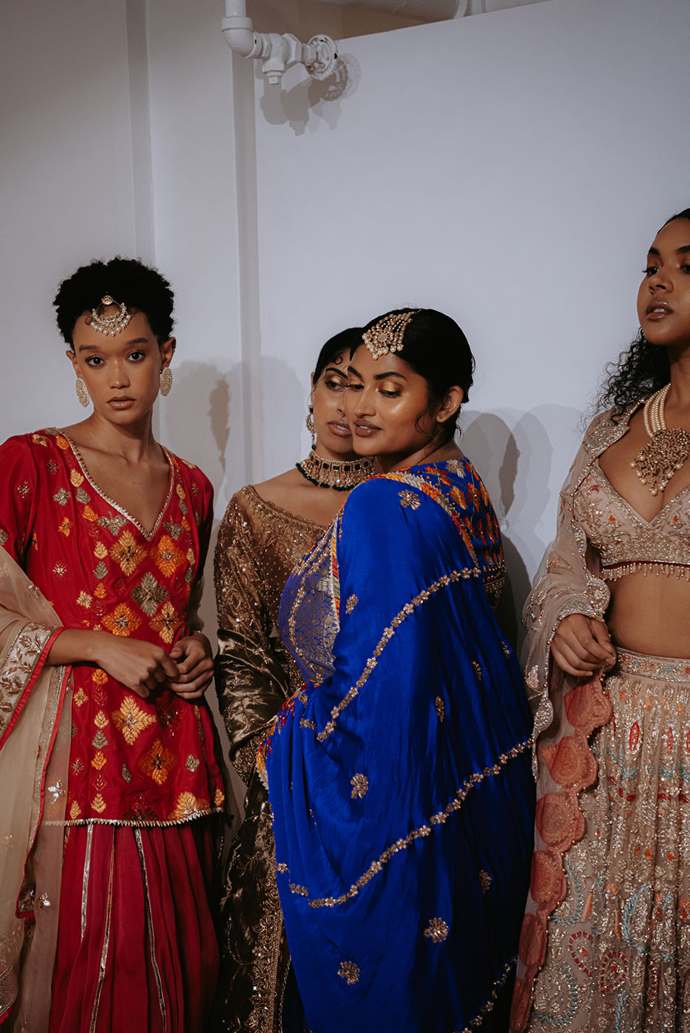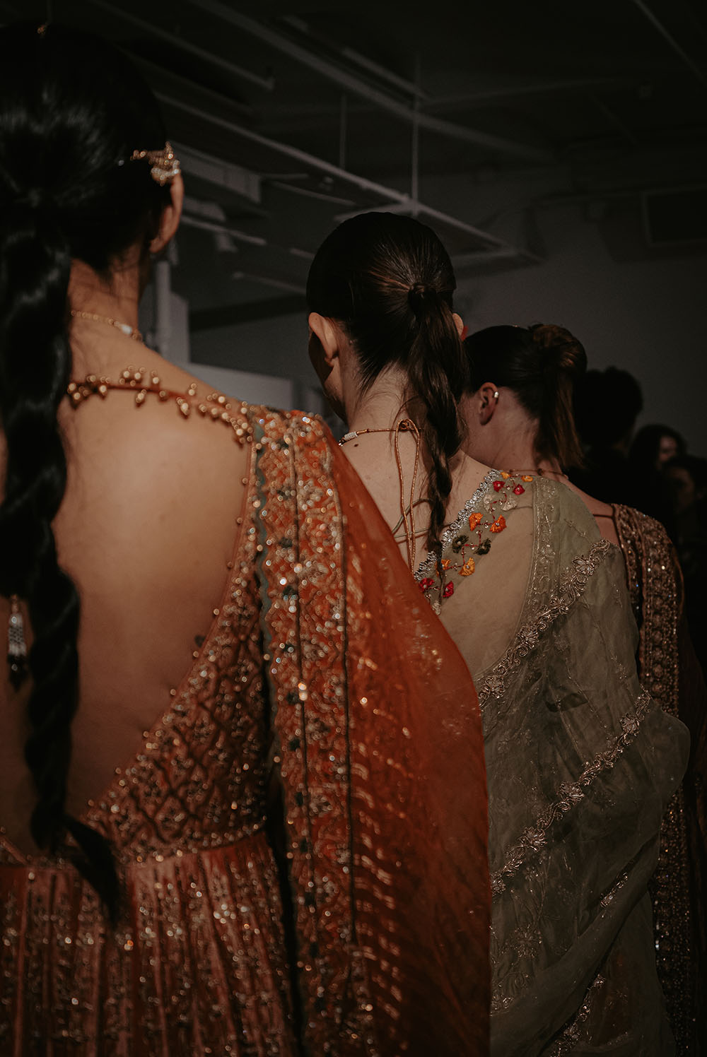 Captured just after final preparations, these intimate shots reveal confident energy of the models as they await their turn on the runway. It’s a powerful moment, where readiness meets anticipation, showcasing the grace and strength behind the artistry of South Asian Fashion.